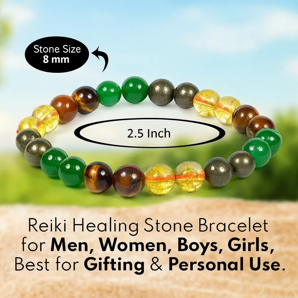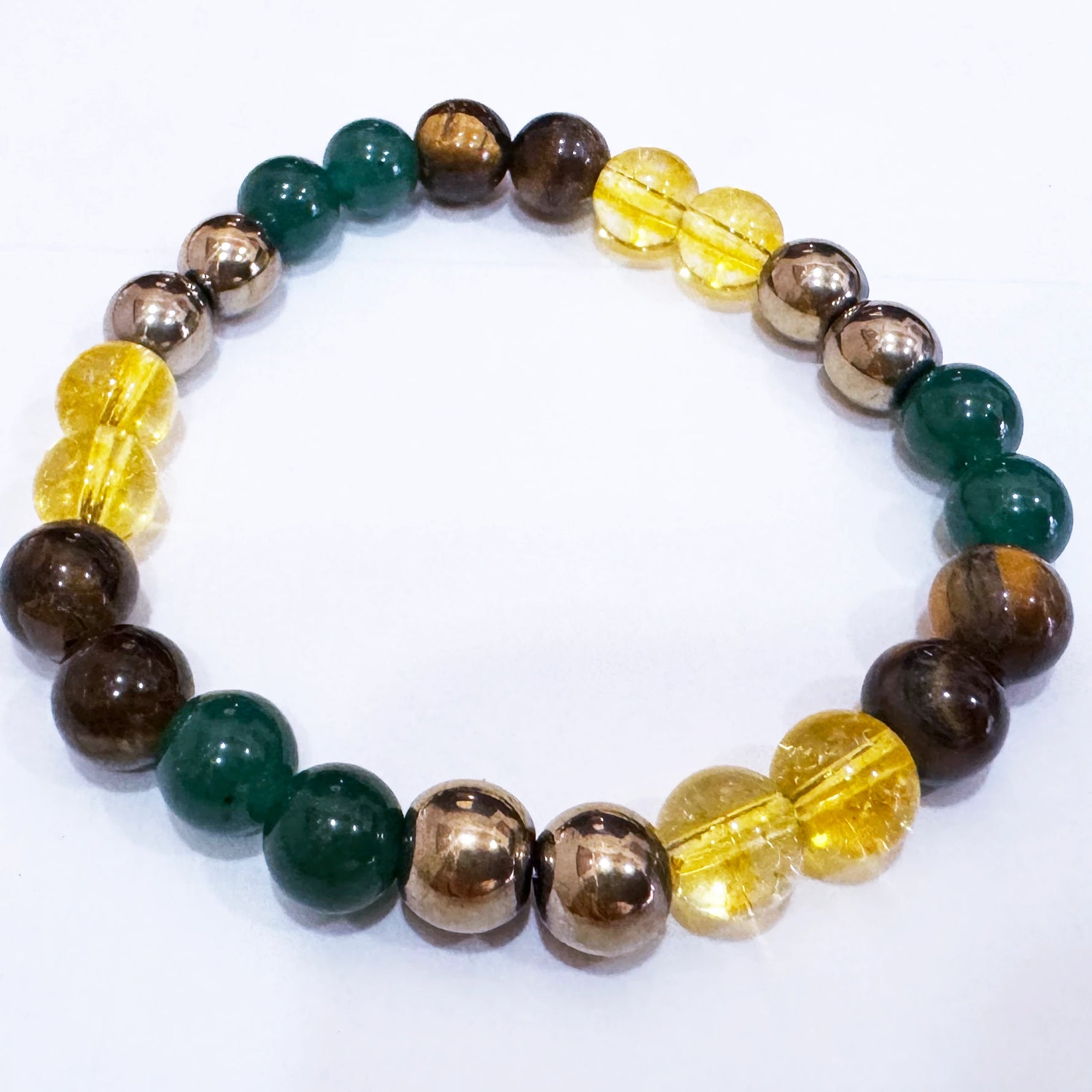 The Dhan yog Bracelet combines Citrine, Pyrite, Green Aventurine, Green Jade, Tiger's Eye, and Clear Quartz (Sphatik) used for bringing abundance, prosperity, and personal strength.