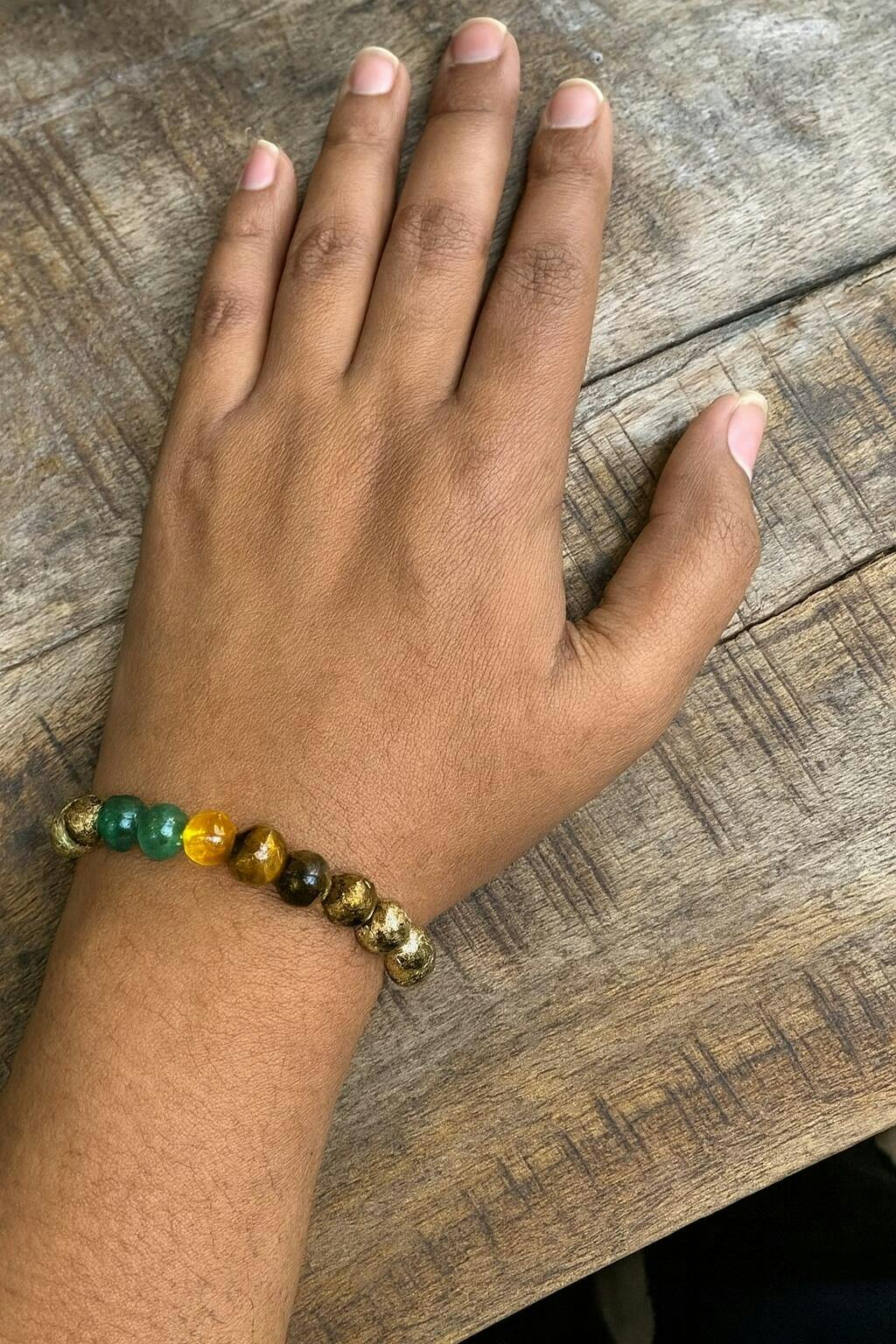 The Dhan Yog Bracelet combines Citrine, Pyrite, Green Aventurine, Green Jade, Tiger's Eye, and Clear Quartz (Sphatik) used for bringing abundance, prosperity, and personal strength.